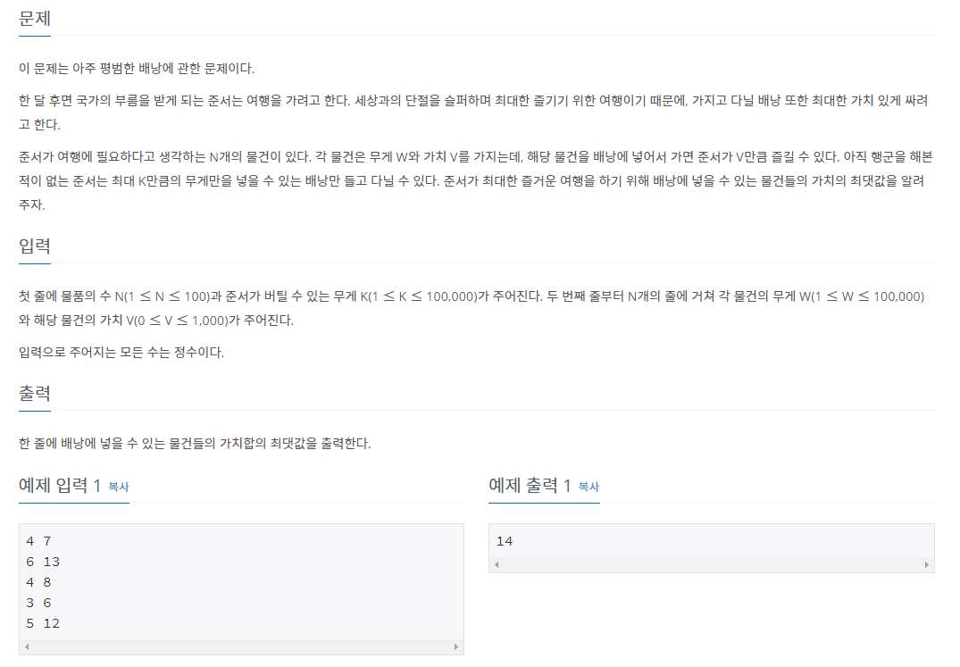 이 문제는 아주 평범한 배낭에 관한 문제이다.