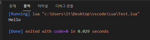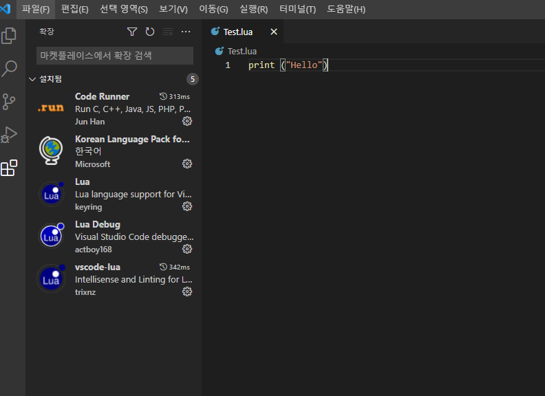 한국어팩 , Code Runner, Lua , Lua Debug 를 설치해준다.