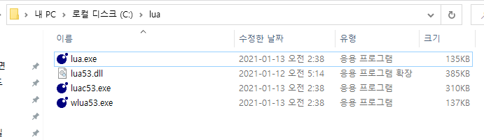 ex) 폴더명은 lua , 파일명은 lua53.exe -> lua.exe