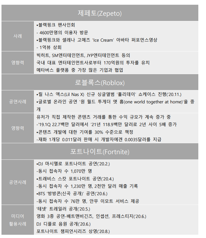 현재 메타버스의 개념에 부합하는 시스템을 가지고 있는 메타버스 플랫폼은 대표적으로 제페토, 마인크래프트, 로블록스가 있다.