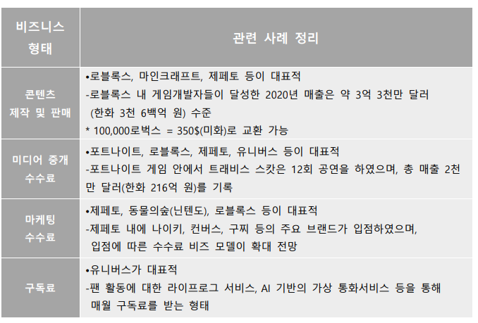 석왕헌, "메타버스 비즈니스 모델 및 생태계 분석", 전자통신동향분석, 36권 5호, 2021, 공공누리 제 4유형