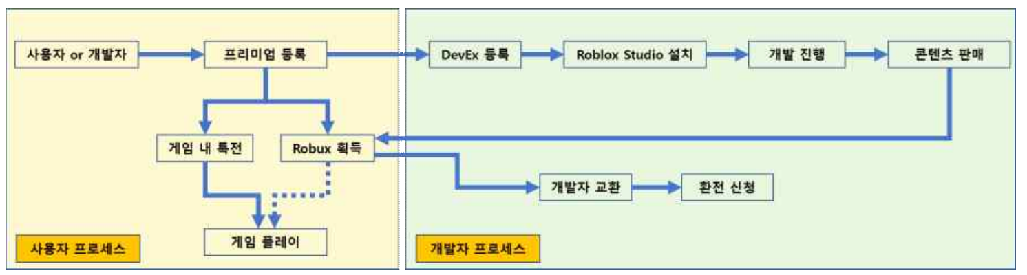 하지만 로블록스의 경우 로블록스 스튜디오 프로그램과 Lua언어를 통해 모든 것을 개발할 수 있다. 또한, 수익을 얻기 위한 구조로 모든 아이템과 게임 패스(일회성 구매를 통해 사용하는 게임 내 아이템과 같은 개념)나 게임 액세스(게임에 대한 입장료 개념) 등 수익화 모델이 잘 되어있다.
