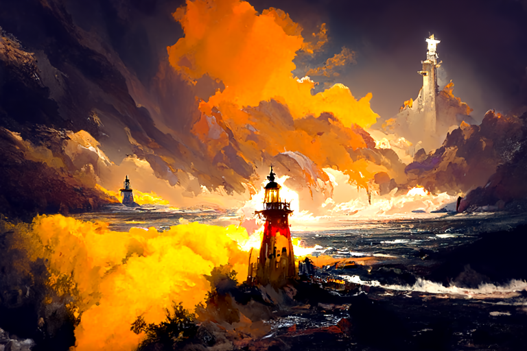 "A beautiful painting of a singular lighthouse, shining its light across a tumultuous sea of blood by greg rutkowski and thomas kinkade, Trending on artstation.”