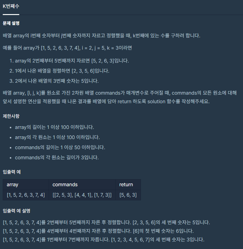 배열 array, [i, j, k]를 원소로 가진 2차원 배열 commands가 매개변수로 주어질 때, commands의 모든 원소에 대해 앞서 설명한 연산을 적용했을 때 나온 결과를 배열에 담아 return 하도록 solution 함수를 작성해주세요.