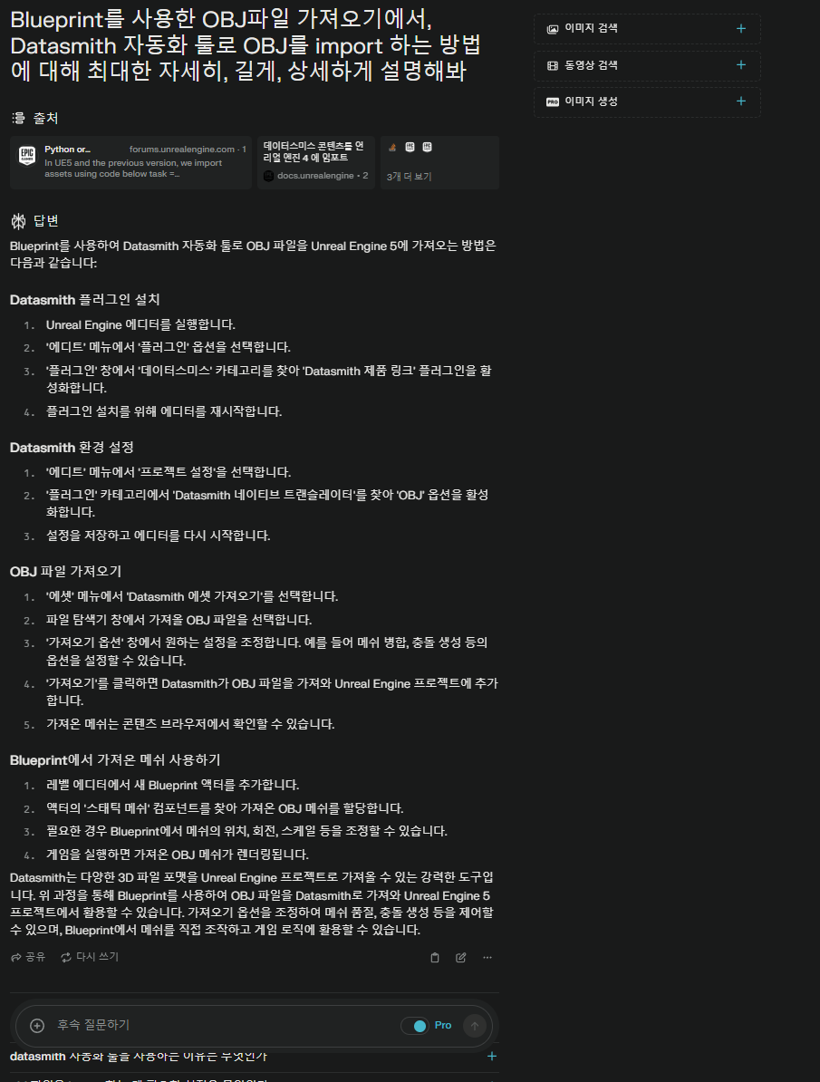 2. **에디터 자동화 툴 사용**: Datasmith와 같은 에디터 자동화 툴을 사용하면 OBJ 파일을 Unreal Engine 프로젝트로 직접 가져올 수 있습니다.