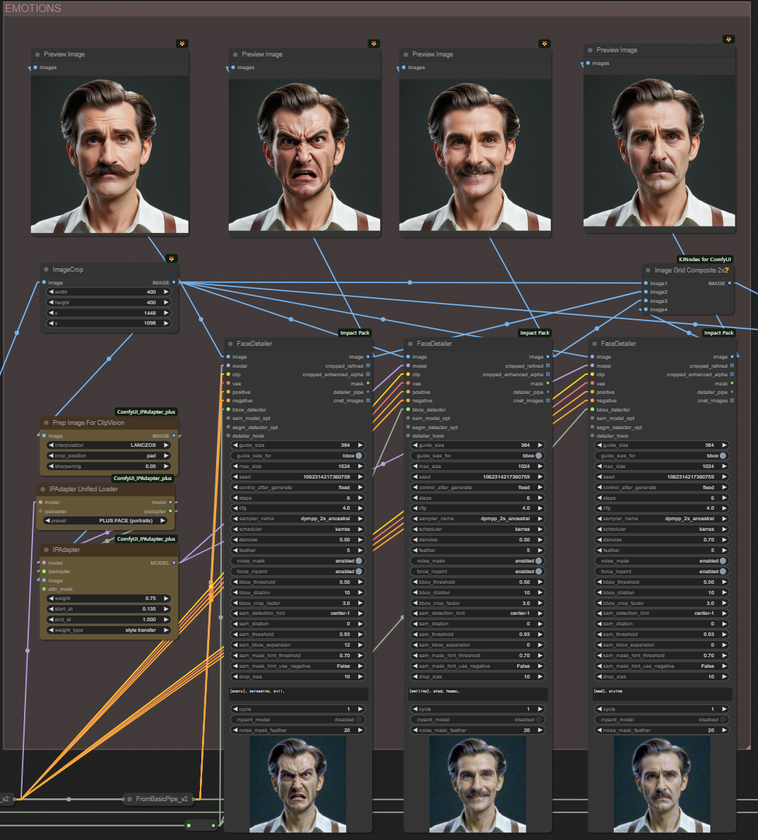 FaceDetailer 노드를 활용, IPAdapter Plus 커스텀 노드를 활용.