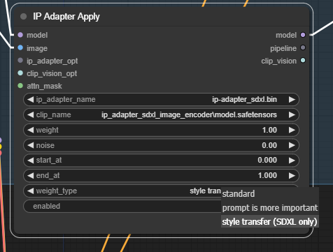 IP Adapter Apply 노드의 weight_type을 style transfer (SDXL only)로 적용 해줘야한다.